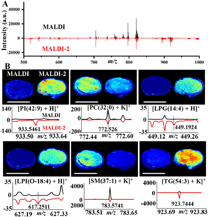 Figure 3  (A) Average mass spectra acquired by using methods of MALDI-2 (the bottom red line) and MALDI (the upper black line) in sections of soybean seeds on germinating day 2 in positive ionization mode using the DHB matrix. Each method included six soybean sections. (B) Representative ion images of lipids in seed sections using methods of MALDI (left) and MALDI-2 (right). Below the ion images, the average ion spectra for MALDI-2 (the bottom red line) and MALDI (the upper black line) were provided. All ion images and spectra were acquired by using the software of SCiLS Lab MVS 2023b (Bruker, Germany). All scale bars were 1 cm.