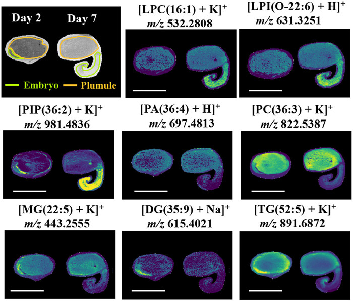 Figure 4  Optical images and representative ion images of sections of soybean seeds on germinating days 2 and 7. In the optical image, the regions outlined by the orange and greenyellow lines represented the regions of the cotyledon and embryo of the seed sections, respectively. All images and spectra were acquired by using the software of SCiLS Lab MVS 2023b (Bruker, Germany). All scale bars were 1 cm.