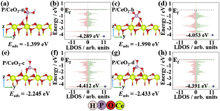 Figure 1.  Calculated structures and LDOS of phosphorylated CeO2 (111) with different HxPO4 (x = 1 or 2). (a, b) P/CeO2-a with one P-O bond, (c, d) P/CeO2-b with two P-OH, (e, f) P/CeO2-c and (g, h) P/CeO2-d differing in the position of surface H. Red: O atoms; yellow: Ce atoms; white: H atoms; prune: P atoms. This notation is used throughout the paper.