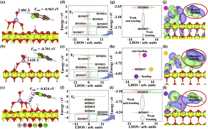 Figure 2.  Calculated adsorption energies and structures of adsorption PhCl on (a) PhCl-P/CeO2-a, (b) PhCl-P/CeO2-b, and (c) PhCl-P/CeO2-c surfaces. The corresponding LDOS on the PhCl molecule (d-f), the enlarged states around its HOMO7 (g-i), and three wavefunction images with corresponding ones labeled by different dots (j-l) are also shown.
