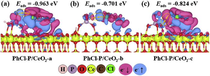We next performed systematic calculations on the adsorption of PhCl on the P/CeO2 surface, which showed that the parallel adsorption of PhCl on the P/CeO2 surfaces are much more stable than the perpendicular adsorption structure and the corresponding adsorption energies are -0.663 eV and -0.293 eV, respectively (Figs. S3 and S4, Table S2 in Supporting information). A careful analysis of the above adsorption configurations also reveals that PhCl will adsorb between a vertical and parallel configuration due to the presence of tetrahedral HxPO4. We also performed an in-depth analysis of the geometrical and electronic structures of the most stable adsorption structures of PhCl on the P/CeO2-a, P/CeO2-b, and P/CeO2-c surfaces.
