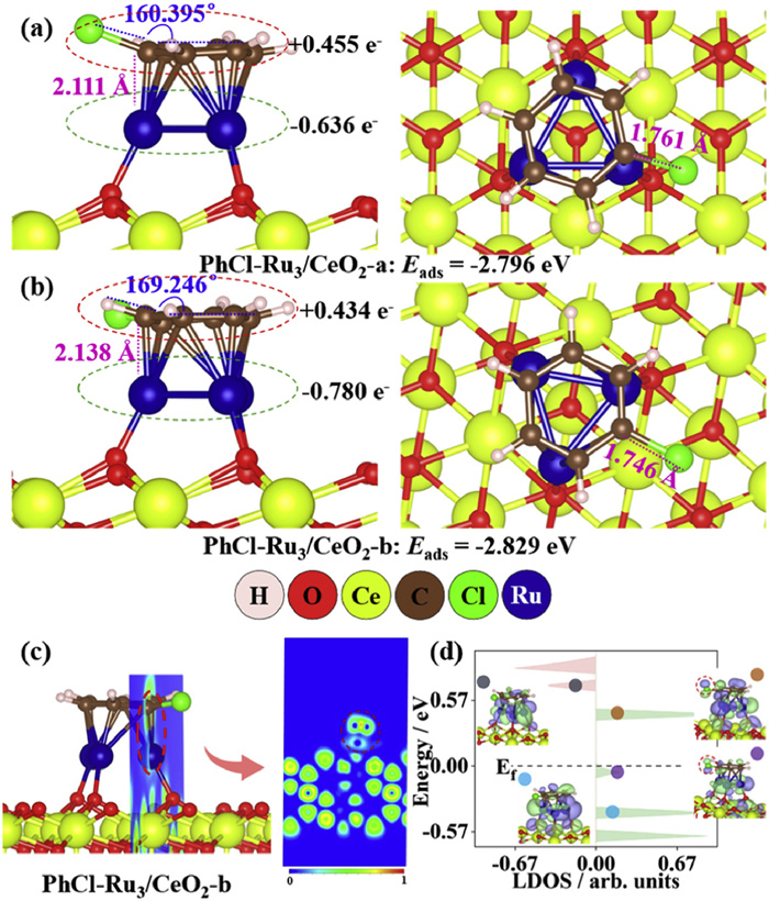 Figure 5  Calculated adsorption energies and structures of PhCl adsorbed on (a) the PhCl-Ru3/CeO2-a, (b) PhCl-Ru3/CeO2-b surfaces and the corresponding Bader charges are also shown. (c) The ELF of PhCl-Ru3/CeO2-a, and (d) the LDOS of the adsorbed PhCl molecules on the PhCl-Ru3/CeO2-a surface. Insets: the corresponding wavefunction image labeled by different dots.