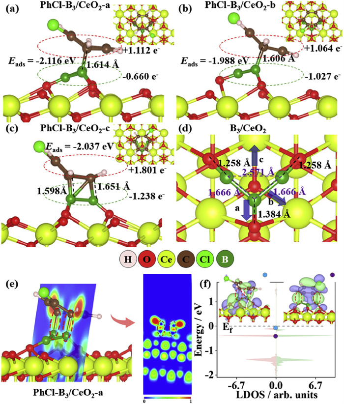 Figure 6  Calculated adsorption energies and structures of PhCl adsorbed on (a) the PhCl-B3/CeO2-a, (b) PhCl-B3/CeO2-b and (c) PhCl-B3/CeO2-c surfaces, and the corresponding Bader charges are also shown. (d) The calculated structures of B3/CeO2 of three directions of initial C-Cl bond orientations. (e) The ELF of PhCl-B3/CeO2-a, and (f) the LDOS of the adsorbed PhCl molecules on the PhCl-B3/CeO2-a surface. Insets: the corresponding wavefunction image labeled by different dots.