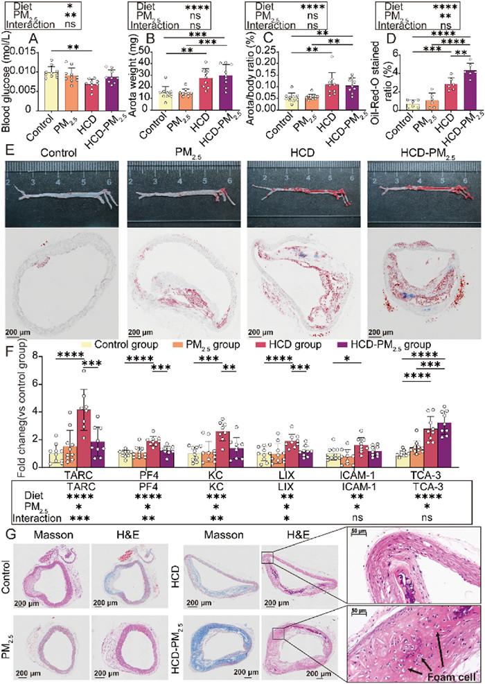 The ApoE−/− mice were provided with HCD and exposed to PM2.5 in cages for 6 months. Compared to the control group, blood glucose was declined impacted by PM2.5 (P < 0.01), while the trend in response to the HCD was the same in the mice (Fig. 1A). The absolute and relative (to body weight) aorta weights have similar changes. A significantly increased trend could only be observed due to the impacts of HCD (Figs. 1B and C, P < 0.001 in Fig. 1B, P < 0.01 in Fig. 1C). The Oil Red-O staining for arteries was a visual way to display atherosclerosis. As illustrated in the cross-sections of arcus aortae photographs, the aortic wall was thickened after the HCD feeding, reducing the vascular inner diameter (Figs. 1D and E). The quantitative results of ORO-stained areas identified PM2.5 and HCD significantly increased the atherosclerotic plaque formation additively (Fig. 1D). Six cytokines exhibited significant alterations, including thymus and activation-regulated chemokine (TARC), platelet factor 4 (PF4), keratinocyte chemoattractant (KC), lipopolysaccharide-induced CXC chemokine (LIX), intercellular cell adhesion molecule-1 (ICAM-1), and T-cell activation protein 3 (TCA-3) (Fig. 1F). Upon HCD introduction, the serum levels of all 6 cytokines elevated in general. TARC had the highest rise among these cytokines, which showed a 4.15-fold increase compared to the control group with a P < 0.0001 (Fig. 1F). PM2.5 exposure triggered an additional increase in TCA-3, which might further aggregate atherogenesis caused by HCD. Moreover, intriguing interaction between PM2.5 and HCD has been evidenced by the changes in the other four cytokines (TARC, PF4, KC, and LIX). Under the HCD-feeding conditions, PM2.5 exposure downregulated the serum levels of these chemokines, suggesting an interaction between dietary factors and air pollutants influencing immune responses. Both H&E and Masson's trichrome staining in the aorta distinctly revealed marked infiltration of inflammatory cells, a larger number of foam cells, the formation of cholesterol crystals, and a greater fibrotic area in the arcus aortae of the co-treated mice (Fig. 1G). The quantitative analysis of the fibrotic area ratio, derived from Masson's trichrome stain, showed that the aortic fibrotic area was impacted by both diet and PM2.5 exposure. PM2.5 exposure resulted in more significant fibrosis in the HCD mice compared to those on a normal diet (Fig. S1 in Supporting information). Together, these data revealed that PM2.5 exposure had negative effects on the pathogenesis of atherosclerosis in mice, and HCD-fed mice were more susceptible to PM2.5-caused damage.