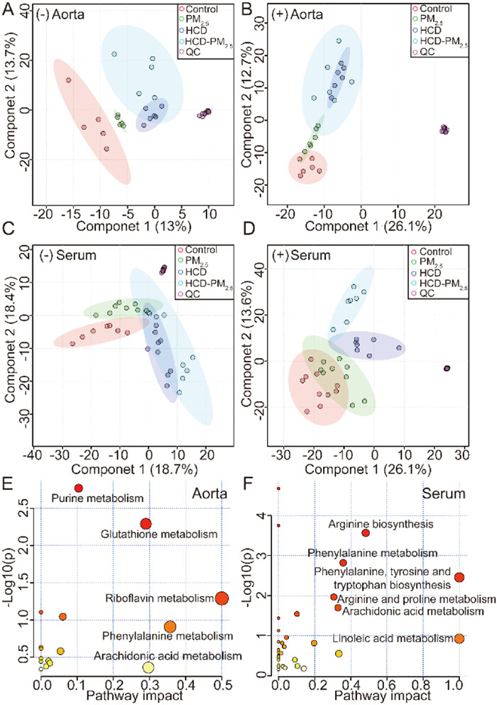 Figure 2.  Influence of PM2.5 exposure on untargeted metabolomic profiles. PLS-DA score charts of aorta metabolomics in positive (A) and negative (B) ionization modes. PLS-DA score of serum metabolomics displays in positive (C) and negative (D) ionization modes. Differential pathway mapping for altered aortic (E) and serum (F) metabolites. Figures were produced via MetaboAnalyst.