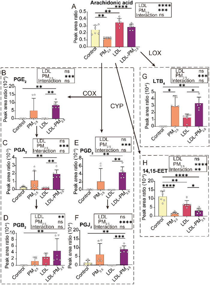 Figure 3.  Metabolic variations in arachidonic acid pathway post PM2.5 and LDL exposure: Concentration comparisons of arachidonic acid (A) and metabolites in COX pathway (B–F), LOX pathway (G), and CYP pathway (H). Values are mean ± SD for 6 samples. Significance denoted by *, P < 0.05; **, P < 0.01; ***, P < 0.001 were from Tukey's multiple comparisons test (on the top of plots) and two-way ANOVA (inserts).