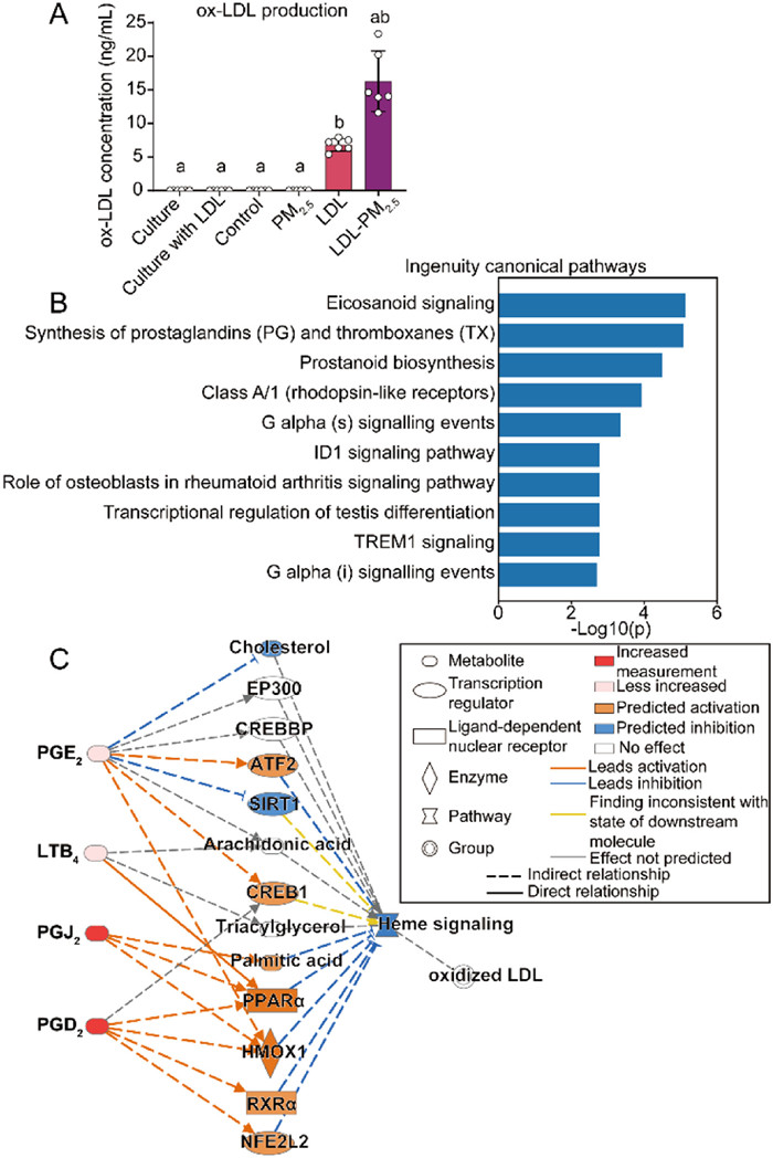 Figure 4.  Analyses of ox-LDL synthesis and LDL oxidation bioinformatics: (A) Quantification of ox-LDL synthesis levels, (B) canonical pathway differentiation between standard LDL and PM2.5-modified LDL groups, (C) metabolite and ox-LDL interaction networks. Data in the subplot (A) are presented as mean ± SD for 6 samples. Statistical significance was determined by one-way ANOVA with Dunnett's post-hoc test, noted with different letters at P < 0.05. The threshold for selecting pathways in Ingenuity Canonical Pathway analysis was set as P < 0.05.