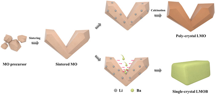 Figure 1.  Schematic diagram of the fabrication of S-MO, SC-LMOB, and PC-LMO. The red arrows and wavy lines indicate the role of BaO flux in promoting crystal fusion and growth. The gray and light green spheres represent the Li source and Ba source, respectively.