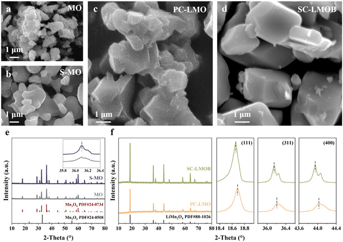 Figure 2.  Morphology and phase composition of the precursors and products. FESEM images of (a) the polycrystalline MO precursor, (b) sintered S-MO precursor, (c) PC-LMO product, and (d) SC-LMOB product. XRD patterns of (e) MO and S-MO precursors and (f) PC-LMO as well as SC-LMOB products, with enlarged views of the (111), (311), and (400) peaks.