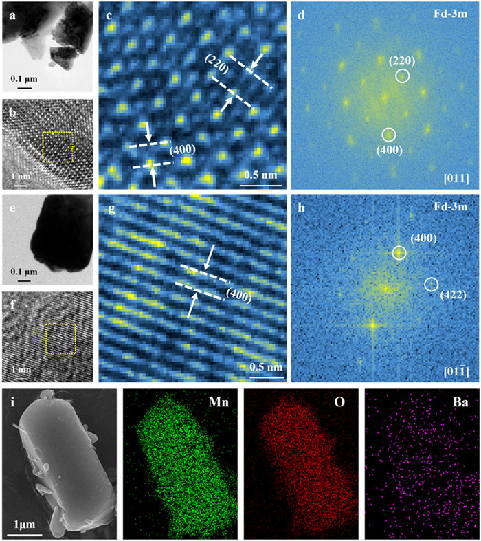 High resolution transmission electron microscopy (HRTEM) was used to observe the crystal structures of PC-LMO and SC-LMOB at microscopic level (Figs. 3a-h). Fig. 3a demonstrates that PC-LMO is composed of multiple irregularly shaped particles bonded together. At a higher magnification, atomic images can be observed in the nanometer-scale regions of the particle surface (Fig. 3b). Enlarging the area within the yellow dashed box and performing a fast Fourier transform (FFT) produces Figs. 3c and d. Precise measurements indicate that the interplanar spacings shown by the two sets of white dashed lines in Fig. 3c are d1 = 0.290 nm and d2 = 0.206 nm, corresponding to the (220) and (400) planes of LMO, respectively [26]. The diffraction spots in the FFT also confirm that the crystal system is Fd-3 m, and the crystal zone axis of this particle is [011] (Fig. 3d) [27]. In contrast, SC-LMOB exhibits a single-particle brick-like morphology (Fig. 3e). At higher magnification, clear lattice fringes with an interplanar spacing of d3 = 0.206 nm, corresponding to the (400) plane of LMO, are observed on the particle surface (Fig. 3g) [9]. Further FFT analysis reveals the presence of the (422), indicating the crystal zone axis is [011] (Fig. 3h). Additionally, energy-dispersive X-ray spectroscopy (EDS) mapping presents uniform distribution of Mn, O, and Ba on the surface of the SC-LMOB particle (Fig. 3i).