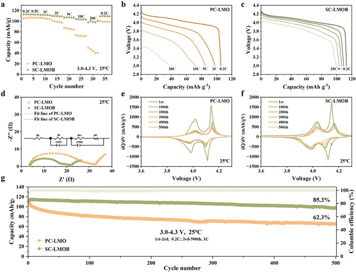 Figure 4  Electrochemical characterization of PC-LMO and SC-LMOB within the voltage range of 3.0–4.3 V at 25 ℃. (a) Rate performance of PC-LMO and SC-LMOB at room temperature. Discharge curves of (b) PC-LMO and (c) SC-LMOB at 0.2, 2, 5, 10, and 20 C, respectively. (d) Electrochemical impedance spectroscopy (EIS) and the corresponding equivalent circuit diagram for the two samples. dQ/dV curves of (e) PC-LMO and (f) SC-LMOB at 0.2 C for the 1st cycle and at 1 C for the 100th, 200th, 300th, 400th, and 500th cycles, respectively. (g) Cycling performance of both samples at 1 C.