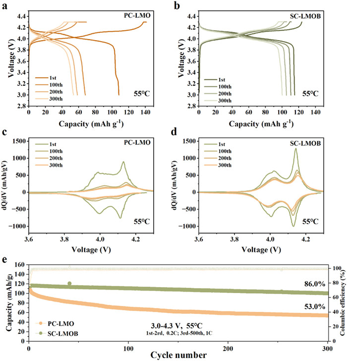 Figure 5  Electrochemical characterization of PC-LMO and SC-LMOB within the voltage window of 3.0–4.3 V at 55 ℃. Charge/discharge curves of (a)PC-LMO and (b) SC-LMOB at 0.2 C for the 1st cycle and at 1 C for the 100th, 200th and 300th cycles, respectively. dQ/dV curves of (c) PC-LMO and (d) SC-LMOB at 0.2 C for the 1st cycle and at 1 C for the 100th, 200th and 300th cycles, respectively. (e) High temperature cycling performance of both samples at 1 C.