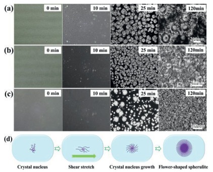 Figure 1.  Optical microscope images of the growth process of spherulites produced by (a) blade coating 10 wt% PEO-LiTFSI concentrated solution, (b) casting 10 wt% PEO-LiTFSI concentrated solution, and (c) casting 4 wt% PEO-LiTFSI dilute solution. (d) Schematic diagram of formation mechanism of flower-like spherulite.