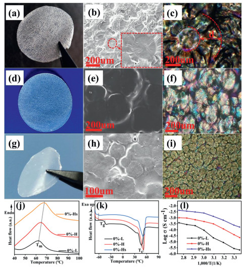 Figure 2.  Morphology and physicochemical properties of three different SPE membranes. (a) The optical image, (b) SEM image and (c) polarizing optical microscopy image of 0%-Hs sample, and the same test for (d-f) sample 0%-H and (g-i) sample 0%-L. (j) The DSC curves of rise and (k) drop temperature function of temperature, and (l) the ionic conductivities of the three SPE samples.