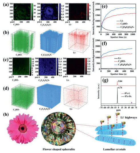 Figure 3.  The research and analysis of Li+ conduction mechanism in 0%-Hs. (a) The 2D images and (b) corresponding 3D views of 0%-Hs in negative ion mode by TOF-SIMS testing. (c, d) The same tests for sample 0%-L. The TOF-SIMS depth profiles for (e) 0%-Hs and (f) 0%-L, and (g) the 7Li NMR spectrum of the sample of 0%-Hs and 0%-L. (h) The POM image of flower-like spherulite and the diagram of Li-ion conduction paths.