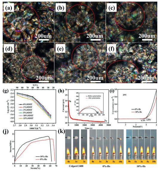 Figure 4  (a-f) The polarizing optical microscopy images of samples doped with 1 wt%−15 wt% of MMTli. (g) The function curves of ionic conductivity and temperature of these CSPEs. (h) Chronoamperometry of the Li/10%-Hs/Li symmetric cell with an applied voltage of 10 mV, and the inset is the impedance spectra of the symmetric cells before and after polarization. (i) LSV scans and (j) stress-strain curves for 0%-Hs and 10%-Hs. (k) The combustion testing comparation with commercial separator.