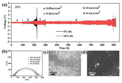 Figure 5.  (a) Voltage profiles of long-term lithium plating/stripping cycles with a 2-h period in Li|0%-Hs|Li and Li|10%-Hs|Li symmetric batteries at the varies current density at room temperature. (b) AC impedance spectra of the lithium symmetric battery before and after cycles, and (c, d) surface morphologies of the corresponding lithium foils after cycles.