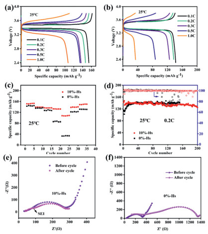 Figure 6.  Electrochemical properties of the solid-state LFP|10%-Hs|Li batteries and LFP|0%-Hs|Li batteries. The charge/discharge curves of the LFP|10%-Hs|Li batteries (a) and LFP|0%-Hs|Li batteries (b) at 0.1, 0.2, 0.3, 0.5 and 1.0 C, respectively, and the corresponding rate (c) and cycle (d) performances, and (e, f) the impedance comparisons before and after the batteries cycles.