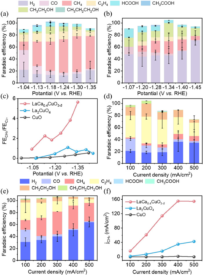 Figure 3.  FEs for ECRR products of (a) LaCa0.4CuO3-δ and (b) La2CuO4 in H-cell. (c) Ratios of FECH4 to FEC2+ in H-cell for all catalysts. FEs for ECRR products of (d) La2CuO4 and (e) LaCa0.4CuO3-δ in MEA. (f) The CH4 partial current density of catalysts at different total current densities in MEA.