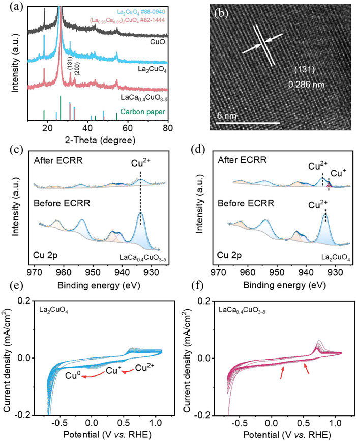 Figure 4.  (a) XRD patterns of commercial CuO, La2CuO4, and LaCa0.4CuO3-δ after electroreduction on carbon paper. (b) HR-TEM image of LaCa0.4CuO3-δ after electroreduction. Cu 2p XPS spectra of (c) LaCa0.4CuO3-δ and (d) La2CuO4 before and after ECRR. Cyclic voltammograms of (e) La2CuO4 and (f) LaCa0.4CuO3-δ at a scan rate of 0.1 V/s in 0.1 mol/L KHCO3.