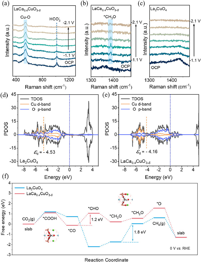 Figure 5.  In situ Raman spectra of (a) LaCa0.4CuO3-δ at different potentials, that with further Raman range of (b) LaCa0.4CuO3-δ and (c) La2CuO4. The density of states of Cu d-band and O p-band of (d) La2CuO4 and (e) LaCa0.4CuO3-δ. (f) Gibbs free energy pathway of CH4 on La2CuO4 and LaCa0.4CuO3-δ models.