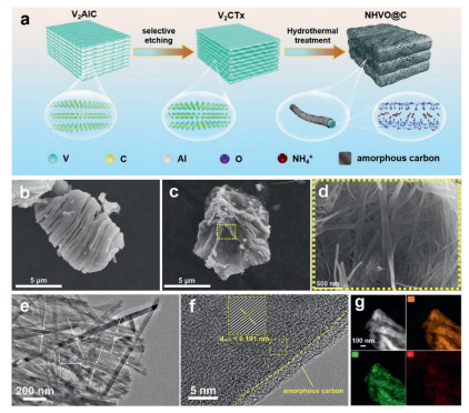 Figure 1.  (a) Synthesis process of NHVO@C composite. SEM image of (b) V2CTx MXene and (c, d) NHVO@C composite. (e) TEM image, (f) HRTEM image, (g) HAADF image and elemental mappings of NHVO@C composite.