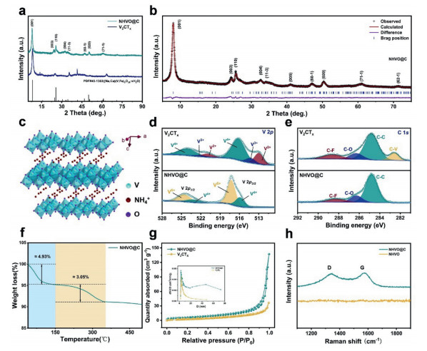 Figure 2.  (a) XRD patterns of the NHVO@C composite and V2CTx MXene. (b) The Rietveld refined XRD pattern of NHVO@C composite. (c) Crystal structure model of NHVO@C composite. (d, e) The high-resolution XPS spectra of V 2p and C 1s of NHVO@C composite and V2CTX MXene, respectively. (f) TGA curve of NHVO@C composite. (g) BET curves of NHVO@C composite and V2CTx MXene. (h) Raman spectra of NHVO@C composite and NHVO sample.