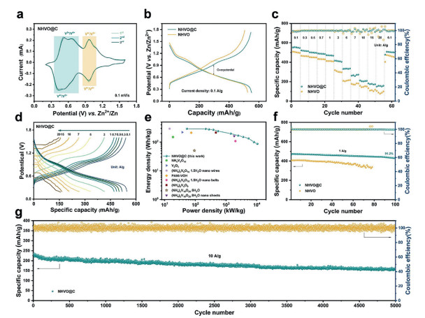 Figure 3.  (a) CV curves of NHVO@C composite in the initial three cycles at 0.1 mV/s. (b) The GCD curves of NHVO@C composite and NHVO at 0.1 A/g in the first cycle. (c) Rate performance of NHVO@C composite and NHVO sample. (d) The corresponding GCD profiles at various current densities of NHVO@C composite. (e) Ragone plot of NHVO@C composite compared with reported vanadium-based cathode materials. (f) Cyclability of NHVO@C composite and NHVO sample at 1 A/g. (g) Long-life cyclability of NHVO@C composite at 10 A/g.