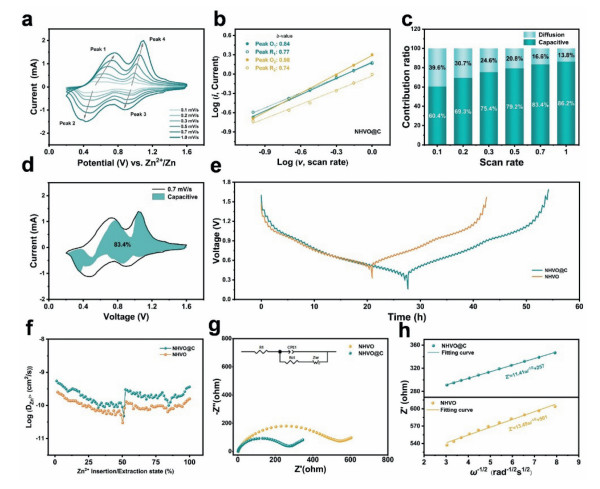 Figure 4.  (a) CV curves of the NHVO@C composite at different scan rates. (b) log(peak current) vs. log(scan rate) plot for each redox peak in NHVO@C composite and their corresponding b values. (c) Capacitive contribution of the NHVO@C composite at various scan rates. (d) Contribution ratios of capacitance and diffusion-controlled of NHVO@C composite at 0.7 mV/s. (e, f) The GITT curves at 0.05 A/g and the corresponding ion-diffusion coefficients of NHVO@C composite. (g) Nyquist plots of the NHVO@C composite and NHVO (inset illustrates the electrical equivalent circuit used for fitting EIS spectra). (h) Plot of the real part of impedance vs. ω−1/2 in the low-frequency region.