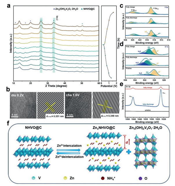 Figure 5.  (a) A complete discharge-charge procedure of NHVO@C electrode at 0.1 A/g and corresponding ex-situ XRD patterns of NHVO@C electrode at selected states. (b) HRTEM and relevant IFFT images of NHVO@C electrode at dis-0.2 V/cha-1.6 V states. (c) V 2p, (d) O 1s, (e) Zn 2p XPS spectra of NHVO@C electrode at different states. (f) Schematic illustration of crystal structure change of NHVO@C electrode during the discharge/charge process.