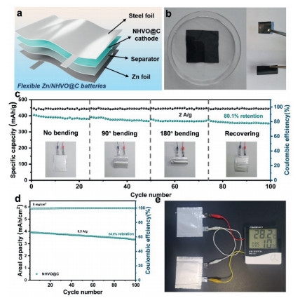 Figure 6.  Practicality testing of flexible NHVO@C composite: (a) Fabrication procedure of the flexible Zn//NHVO@C soft pack batteries. (b) Optical photographs showing a flexible NHVO@C composite film folded twice in half. (c) Cycling performance (current density of 2.0 A/g) of Zn//NHVO@C soft pack batteries in straight and various bending states. (d) Cycling performances of the Zn//NHVO@C batteries with high-loading active material of ~8.0 mg/cm2 at 0.5 A/g. (e) Optical photograph of an electronic thermometer powered by two Zn//NHVO@C soft pack ZIBs in series with high-loading active material of ~10.2 mg/cm2.