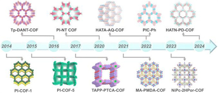 Figure 1 The development timeline of representative PI-COFs. Image for PI-COF-1: Reproduced with permission [11]. Copyright 2014, Springer Nature. Image for PI-COF-5: Reproduced with permission [12]. Copyright 2015, American Chemical Society. Image for Tp-DANT-COF: Reproduced with permission [13]. Copyright 2016, Royal Society of Chemistry. Image for TAAP-PTCA-COF: Reproduced with permission [14]. Copyright 2017, American Chemical Society. Image for PI-NT COF: Reproduced with permission [15]. Copyright 2020, American Chemical Society. Image for MA-PMDA-COF: Reproduced with permission [16]. Copyright 2021, American Chemical Society. Image for HATA-AQ-COF and PIC-pH: Reproduced with permission [17,18]. Copyright 2022, Wiley-VCH. Image for NiPc-2HPor COF: Reproduced with permission [19]. Copyright 2023, Oxford University Press. Image for HATN-PD-COF: Reproduced with permission [20]. Copyright 2024, Springer Nature.