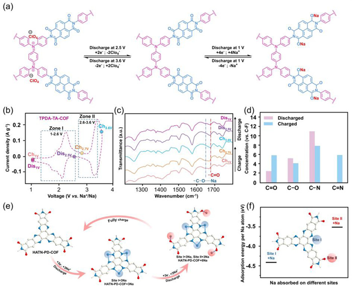 Figure 10 Redox mechanism and characterization during the charging-discharging process of TPDA-NDI-COF and HATN-PD-COF. (a) Mechanism investigation of TPDA-NDI-COF in NaClO4. (b) CV of charge and discharge profile and (c) ex-situ FT-IR spectra. (d) The concentration of bond intensities during the charging and discharging process. Reproduced with permission [101]. Copyright 2024, Wiley-VCH. (e) Structural evolution during the sodiation/desodiation process. (f) The adsorption energy per Na+ ion of HATN-PD-COF. Reproduced with permission [20]. Copyright 2024, Springer Nature.