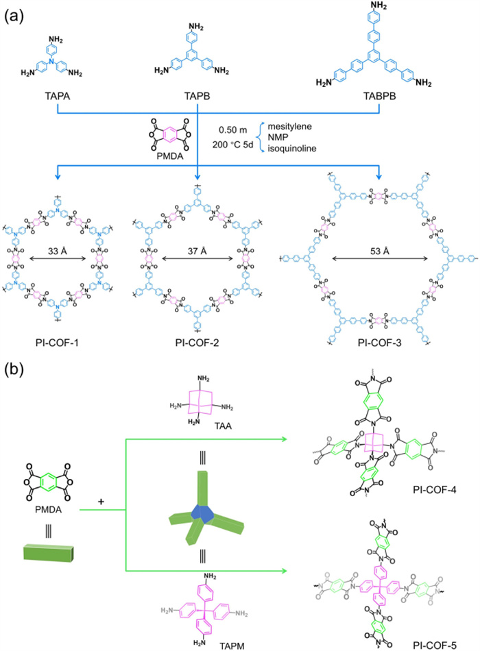 Figure 3 Strategy for preparing 2D or 3D porous crystalline PI-COFs under solvothermal conditions. (a) 2D PI-COF-1, 2D PI-COF-2 and 2D PI-COF-3. Reproduced with permission [11]. Copyright 2014, Springer Nature. (b) 3D PI-COF-4 and 3D PI-COF-5. Reproduced with permission [12]. Reproduced with permission. Copyright 2015, American Chemical Society.