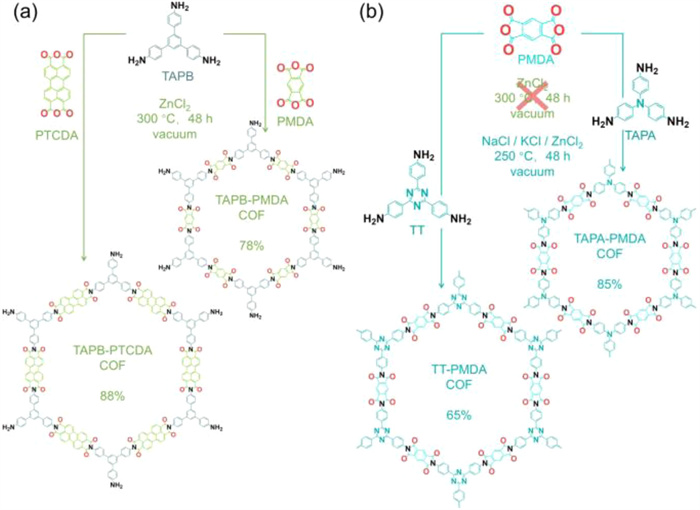Figure 4 Schematic illustration for the syntheses of TAPB-based PI-COFs and PMDA-based PI-COFs under ionothermal conditions. (a) In ZnCl2. (b) In an eutectic salt mixture [39].