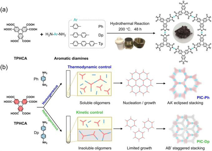 Figure 5. Synthesis and mechanism of TPHCA-pH/Dp/Tp COFs. (a) Illustration of the hydrothermal synthesis method and (b) the proposed reaction pathways of PIC-pH and PIC-Dp. Reproduced with permission [18]. Copyright 2022, Wiley-VCH.As a simple, green and low-cost synthesis strategy, hydrothermal synthesis requires further in-depth understanding for its application in the synthesis of PI-COFs. It should be noted that the solubility of the monomers and intermediates in water is crucial for controlling the crystallinity of related PI-COFs. Even though, hydrothermal synthesis is still one of the most promising methods to obtain highly crystalline PI-COFs, which can provide accurate structural information, and more efforts are still needed to contribute to this hot topic.
