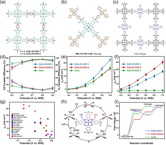 Figure 8 Schematic representation and electrocatalytic CO2RR performances of the four phthalocyanine-based PI-COFs. (a) 2D CoPc-PI-COF, Reproduced with permission [73]. Copyright 2021, American Chemical Society. (b) 3D CoPc-PI-COF-3. Reproduced with permission [51]. Copyright 2021, Wiley-VCH. (c) CoPc-2H2Por. Reproduced with permission [45]. Copyright 2022, Wiley-VCH. (d) Faradaic efficiency. (e) Partial CO current density. Reproduced with permission [73]. Copyright 2021, American Chemical Society. (f) Faradaic efficiency. (g) jCO of CoPc-PI-COF-3 in H-type electrochemical cell. Reproduced with permission [51]. Copyright 2021, Wiley-VCH. (h) Proposed mechanism and (i) free energy diagram for the CO2RR process of CoPc-2H2Por. Reproduced with permission [45]. Copyright 2022, Wiley-VCH.