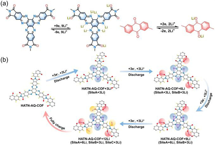 Figure 9 Possible lithium storage processes of HATN-AQ-COF. (a) The lithium binding sites of HATN-AQ-COF. (b) Possible lithium storage process of HATN-AQ-COF. Reproduced with permission [17]. Copyright 2022, Wiley-VCH.