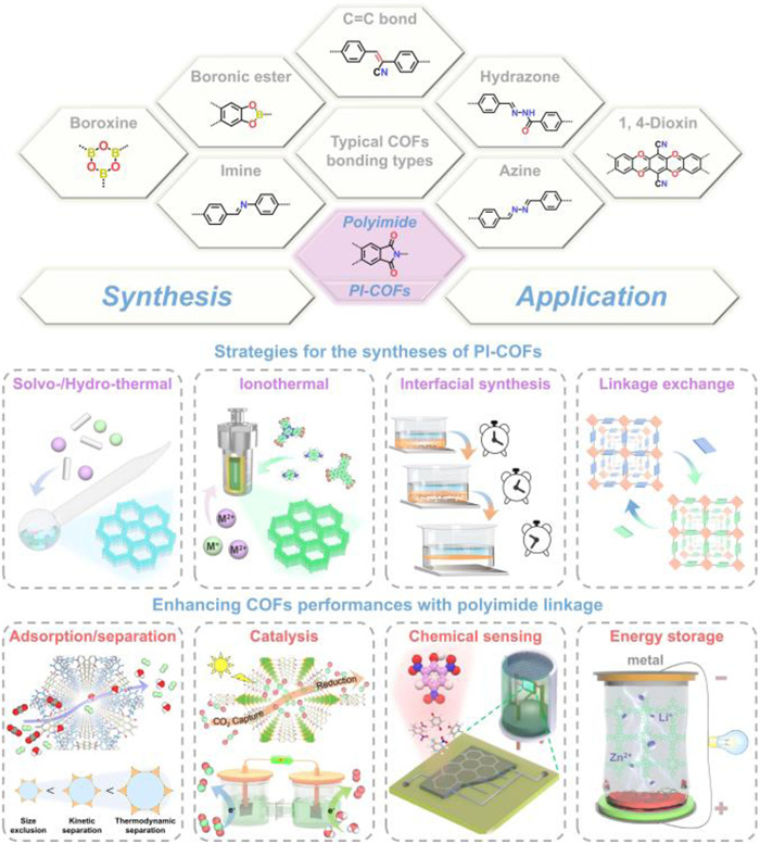 Polyimide-linkage covalent organic frameworks (PI-COFs), a class of crystalline porous materials first reported by Yan et al. in 2014, integrate the structural tunability and crystallinity of COFs with the robustness of PI linkages (Scheme 1 and Fig. 1) [11]. They inherit excellent thermal and chemical stability from PIs while maintaining the porosity and crystallinity of traditional COFs [12-20]. By integrating the PI backbone into the COFs structures, PI-COFs achieve broader functionality and enhanced adjustability [21-30]. These features make PI-COFs promising for diverse applications including adsorption/separation, photo-/electro-electrocatalysis, energy storage, and sensing. In particular, PI-COFs offer several unique advantages: (1) Electronegative heteroatoms (e.g., N, O) enable strong metal coordination and electron-density modulation [31]; (2) bipolar active centers (C=O and C−N) support fast ion transport and storage [32]; (3) carbonyl-rich PI units could introduce redox-active sites [33]; (4) the robust PI linkage ensures stability under harsh conditions [34]; and (5) reactive aromatic units allow versatile structural tuning and modification [35]. Together, these attributes define the distinct position of PI-COFs among COF materials and underscore their potential for functional applications.