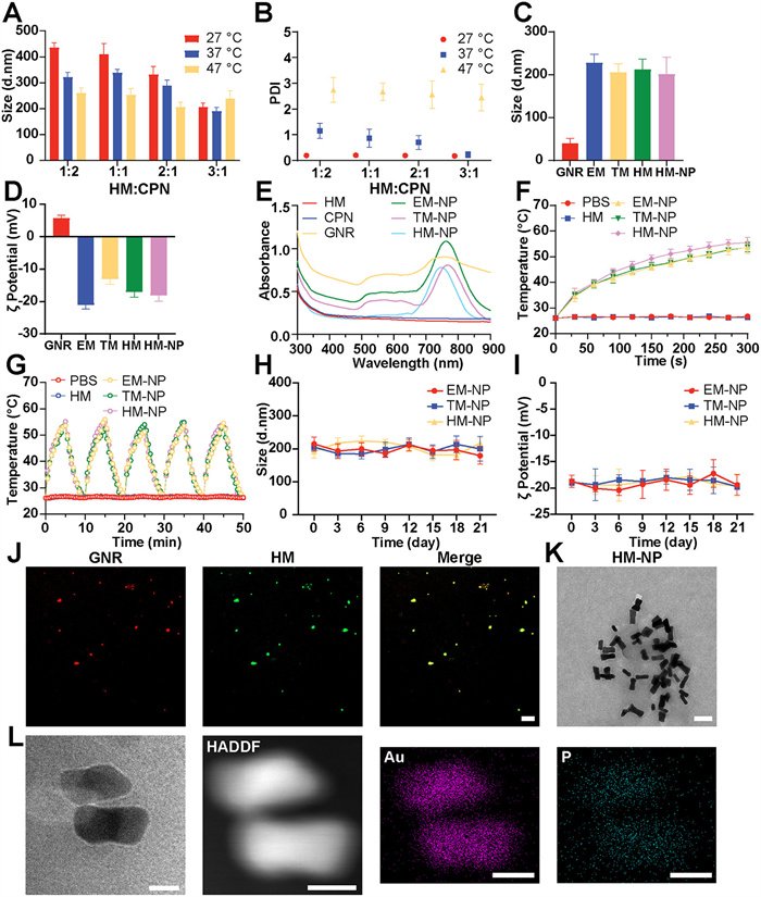 Figure 1  Preparation and characterization of HM-NP. (A, B) The size and PDI of HM-CPN prepared using different mass ratios of HM and CPN. (C, D) The size and ζ potential of GNR, EM, TM, HM and HM-NP. (E) UV absorption spectrum of HM, CPN, GNR, EM-NP, TM-NP and HM-NP. (F) Temperature changes of PBS, HM, EM-NP, TM-NP and HM-NP (all at a concentration of 200 µg/mL) under 780 nm laser at 1.5 W/cm2 for 5 min. (G) Temperature variations of PBS, HM, EM-NP, TM-NP and HM-NP throughout 5 cycles of laser irradiation on/off. (H, I) The size and ζ potential changes of EM-NP, TM-NP and HM-NP in PBS for 21 days. (J) Confocal microscopy images of HM-NP. Scale bar: 50 µm. (K) Exemplary images captured by TEM depicting HM-NP. Scale bar: 50 nm. (L) TEM and elemental mapping images of HM-NP. Scale bar: 20 nm. Data are presented as mean ± standard deviation (SD) (n = 3).