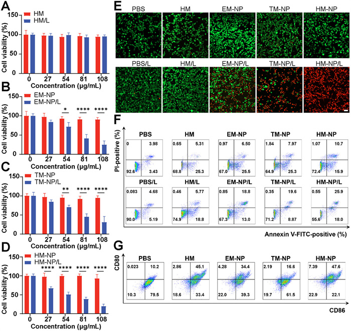 Figure 3.  In vitro evaluation of the antitumor efficacy of HM-NP. (A–D) Cell survival rate of MB49 cells following HM, EM-NP, TM-NP, or HM-NP co-culturation with/without laser. Data are presented as mean ± SD (n = 3). P < 0.05, **P < 0.01, ****P < 0.0001. (E) The CLSM images depicting the staining of calcein AM (in green) and propidium iodide (in red) in MB49 cells post various interventions. Scale bar: 50 µm. (F) Flow cytometry-based apoptotic analysis of MB49 cells after different treatments. (G) Flow cytometric analysis of the expressed CD80 and CD86, which were the makers for activated BMDC cells, after in vitro incubation of BMDC cells with PBS, HM, EM-NP, TM-NP and HM-NP for 24 h.