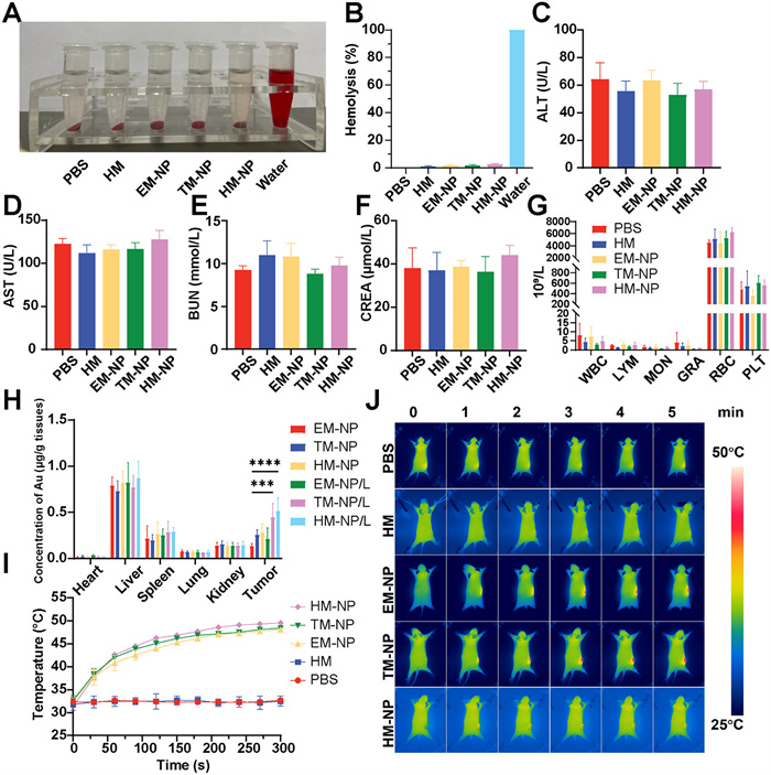 Figure 4  Analysis of biosecurity, tissue distribution and photothermal performance. (A) Images and (B) quantitative assessment of the hemolysis assay following various interventions, with water serving as a positive control. (C–F) Biochemistry analysis of C57 mice following intravenous injection with PBS, HM, EM-NP, TM-NP and HM-NP. (G) Hematological analysis of C57 mice post administration with PBS, HM, EM-NP, TM-NP, and HM-NP. (H) Distribution of Au element 24 h following intravenous injection of EM-NP, TM-NP, and HM-NP with or without NIR irradiation, analyzed by ICP-MS. (I) Temperature fluctuations in tumor areas under laser exposure at 1.5 W/cm2 for 5 min. (J) Infrared thermal imaging of various groups following 780 nm laser at 1.5 W/cm2 for 5 min. Data are presented as mean ± SD (n = 3). ***P < 0.001, ****P < 0.0001.