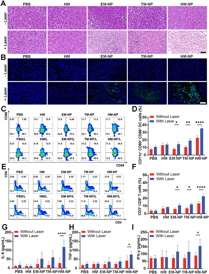 Figure 6.  In vivo antitumor and immune activation effect of HM-NP. (A) H&E staining of tumor after different treatments. Scale bar: 50 µm. (B) Immunofluorescence analysis of TUNEL staining within the tumor regions following multiple interventions. Scale bar: 50 µm. (C) Flow cytometry analysis demonstrated the expression of CD80 and CD86 (gated by CD11c), and (D) the proportion of CD80+CD86+ DC cells in MB49 tumors. (E) Flow cytometry analysis revealed the expression of CD8 and CD4 (gated by CD3), and (F) the proportion of CD3+CD8+ T cells in MB49 tumors. (G–I) ELISA analysis of the levels of IL-6, TNF-α, and IFN-γ in serum after various interventions (n = 3). Data are presented as mean ± SD (n = 3). P < 0.05, **P < 0.01, ****P < 0.0001.