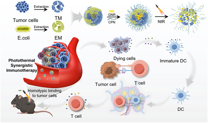 In this study, we synthesized dual-functional hybrid membrane nanoparticles (HM-NPs) incorporating gold nanorods (GNRs) and a thermally responsive polymer shell, demonstrating temperature and light dual-sensitive properties (Scheme 1). The shell, composed of HM and organic membrane OCMC-graft-PNIPAM (chitosan-graft-poly(N-isopropylacrylamide) (CPN)), provides homologous targeting, immune stimulation, and controlled release properties. Under in situ near-infrared (NIR) light stimulation, heat generated by the GNRs induces shrinkage of the CPN, promoting the disintegration of shell and the burst release of HM, enhancing local concentration of antigens at the tumor site. This photoimmunotherapy holds promise for safer and more effective anti-tumor efficacy, with reduced systemic toxicity, contributing to biomedical research and medicine.