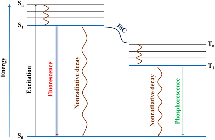 A simplified Jablonski diagram illustrates the process of fluorescence and related phenomenon (Fig. 1). Upon absorption of a photon, electrons in the singlet ground state (S0) are excited to a higher energy state (Sn) and then quickly undergo vibrational relaxation to the first singlet excited state (S1). Subsequently, the S1 state can return to the S0 through various pathways. Fluorescence occurs when a photon is emitted during this transition. The S1 state may also return to the ground state through nonradiative thermal deactivation transitions, inducing the generation of heat energy. Additionally, the excited molecule may undergo intersystem crossing (ISC) to the triplet state (T1), which may decay back to the ground state either through heat release or phosphorescence.