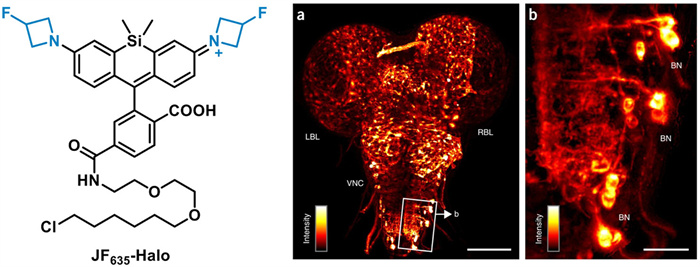 Figure 10.  Staining of Drosophila larvae with JF635-Halo. (a) SiMView light-sheet microscopy image of the CNS of a third instar Drosophila larva stained with JF635-Halo. (b) Magnification of the boxed area in (a). Reproduced with permission [62]. Copyright 2017, Springer Nature.