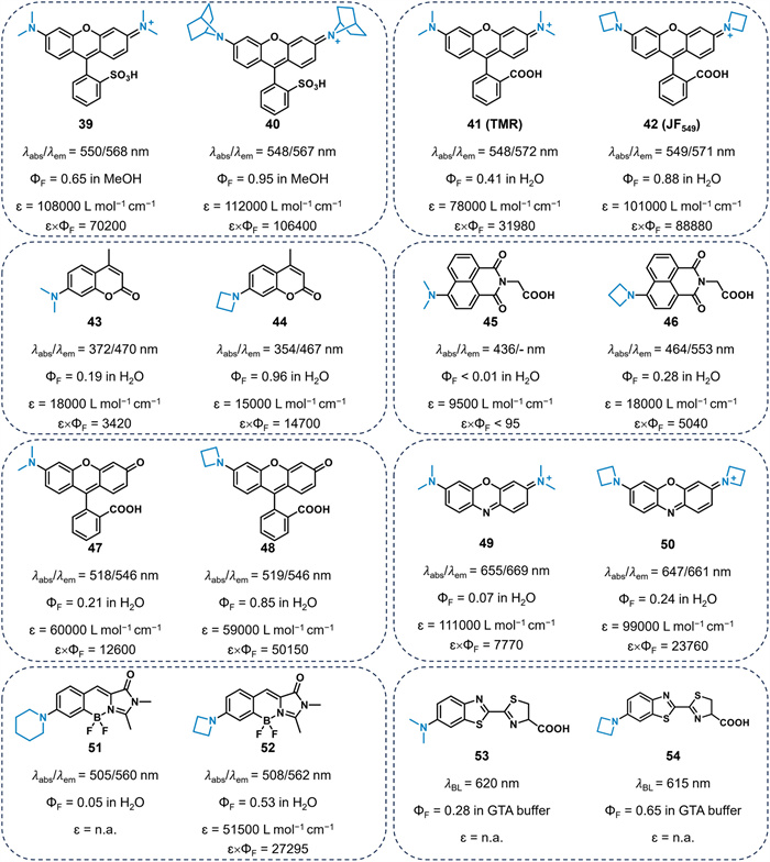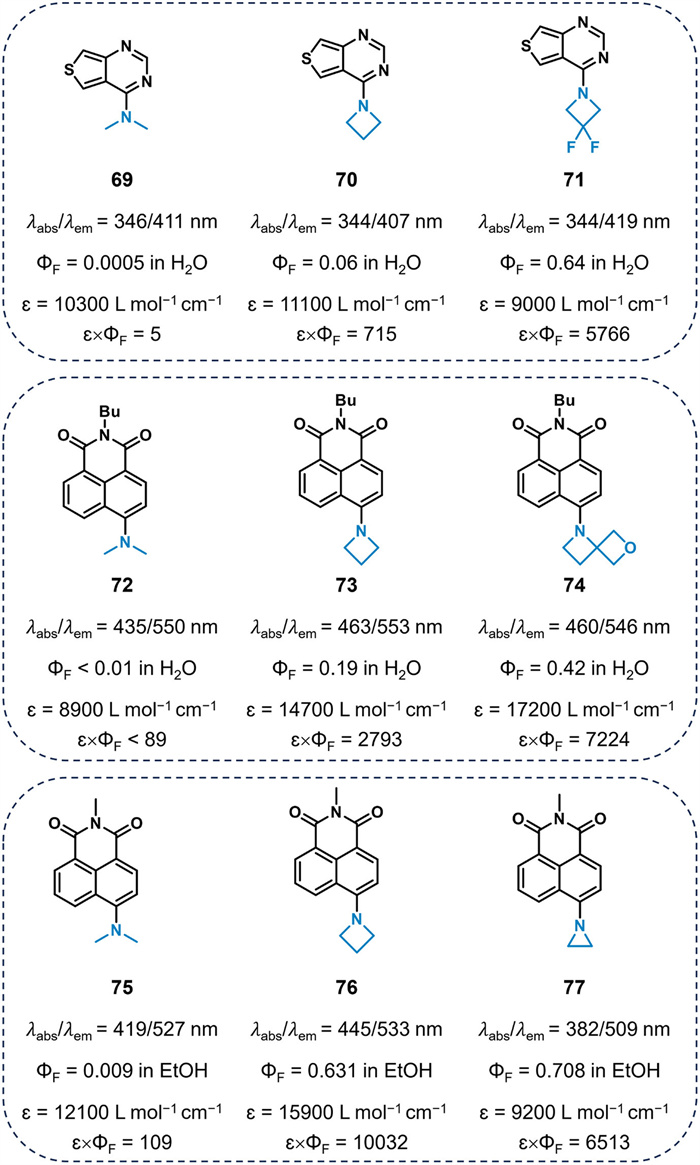 Inspired by this study, Baranov et al. designed GFP analogues 52 with an azetidinyl ring substituent, which proved effective at enhancing the quantum yield of 51 in water (from 0.05 with 51 to 0.53 with 52) [59]. Miller and Citterio's groups extended this strategy to firefly luciferin analogues, which demonstrated enhanced bioluminescence due to azetidine substitution [60, 61]. Compared to the N, N-dimethylamino compound 53 (ΦF = 0.28 in water), azetidine-substituted compound 54 demonstrated a 2.3-fold increase in fluorescence quantum yield (ΦF = 0.65).