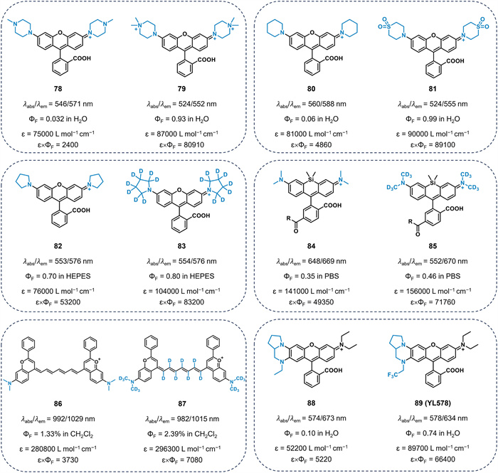 Lavis and coworkers proposed a comprehensive method to enhance the brightness and photostability of fluorophores by substituting hydrogen (H) atoms in N-alkyl groups with deuterium (D) [77]. Deuteration reduces the electron donor strength of the auxochrome, thereby reducing the effectiveness of the TICT process. For example, deuterated pyrrolidine dye 83 (ΦF = 0.8) exhibited a higher quantum yield and greater photostability compared to parent dye 82 (ΦF = 0.7). They successfully applied this approach to a wide range of fluorophores, including coumarin, phenoxazine, carbon rhodamine, and silicon rhodamine, resulting in enhanced brightness. Furthermore, Broichhagen et al. reported that a deuterium congener of tetramethyl(silicon)rhodamine 85 (ΦF = 0.46, ɛ×ΦF = 71, 760) exhibited a higher brightness compared to the parent dye 84 (ΦF = 0.35, ɛ×ΦF = 49, 350) in PBS [78]. Recently, Stacko and co-workers utilized this strategy to improve the brightness of heptamethine cyanine dyes [79]. In comparison to compound 86 (ΦF = 1.33% in CH2Cl2, ɛ×ΦF = 3, 730), deuterium-substituted cyanine 87 displayed higher brightness (ΦF = 2.39% in CH2Cl2, ɛ×ΦF = 7, 080). In 2018, our group designed and synthesized asymmetric rhodamines incorporating 1, 4-diethyl-decahydroquinoxaline. These novel dyes exhibited an enhanced Stokes shift (> 80 nm), but their quantum yields significantly decreased [80]. Recently, our group introduced a stronger electron-withdrawing ability of quinoxaline in these dyes, resulting in higher quantum yield [81]. For example, compound 89 (YL578) exhibited a 7.4-fold increase in quantum yield (ΦF = 0.74) in aqueous solution compared to its parent fluorophore 88 (ΦF = 0.1). The YL578-based probe YL578-Halo could be used for 3D STED imaging of whole mitochondria (Fig. 13b). This strategy could also be extended to other dye skeletons, such as coumarin, rhodol, and acridine derivatives, resulting in a significant increase in brightness. However, it is worth mentioning that the emission wavelengths of these dyes (such as 79, 81, 89) are blue-shifted due to the reduced electron-donating capacity of the auxochrome compared to their parent compounds.