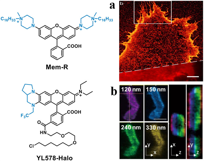Figure 13  Molecular structures of Mem-R and YL578-Halo and their corresponding super-resolution imaging performance. (a) A super-resolution image of the plasma membrane of a live HeLa cell stained with Mem-R. Reproduced with permission [74]. Copyright 2019, American Chemical Society. (b) 3D STED images of mitochondria stained with YL578-Halo. Reproduced with permission [81]. Copyright 2022, The Author(s). Published by Springer Nature. This publication is licensed under CC-BY 4.0.