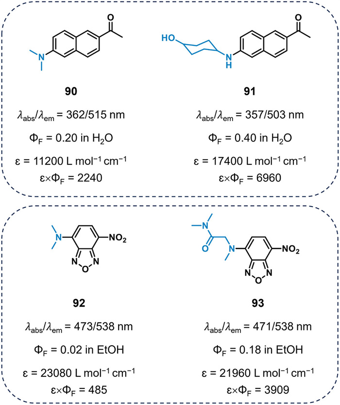 Chemists have also investigated the interaction between dyes and solvents to reduce the TICT effect and enhance brightness. Many D-A dyes possess a dipole structure, which facilitates dipole-dipole interactions with polar solvents that stabilize TICT states. Therefore, minimizing the interaction between dyes and solvents is essential to inhibit TICT state formation (Fig. 14). For example, Ahn et al. synthesized a series of acedan derivatives by modifying the auxochrome of acedan dyes [82]. The aminocyclohexanol-substituted molecule 91 exhibited a quantum yield of 0.40 in water, significantly higher than that of the N, N-dimethyl-substituted compound 90 (ΦF = 0.20). The authors attributed this finding to the cyclohexanol substituent, which prevents hydrogen bonding between the amine nitrogen and water molecules, effectively inhibiting the formation of TICT. Furthermore, they applied this approach to other popular dipolar dyes, including naphthylimide, coumarin, and NBD, successfully increasing their quantum yields. In 2019, Zhang's group reduced the solvent interactions of the amino group by introducing a β-carbonyl-based polar substituent [83]. Compared to N, N-dimethylamino NBD 92 (ΦF = 0.02), the β-carbonyl-substituted NBD 93 displayed a nine-fold increase in fluorescence quantum yield (ΦF = 0.18 in ethanol). The group found that other β-carbonyl-substituted D-A dyes, such as naphthalimide, coumarin, and PRODAN, also exhibited higher quantum yields and brightness.